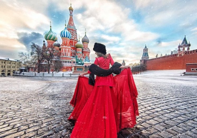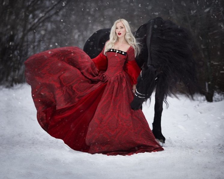 Фотосессия с лошадью в прекрасное платье в зимнюю пору.