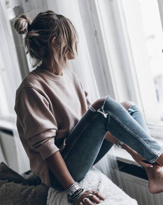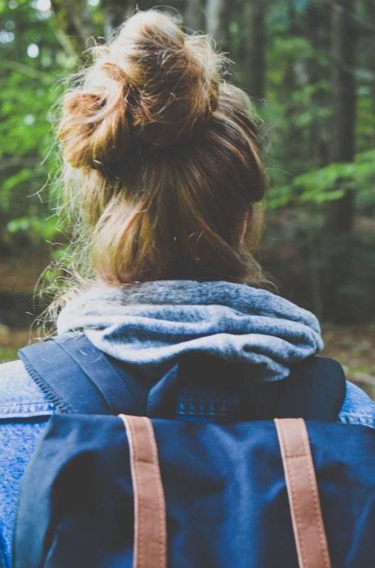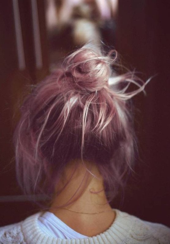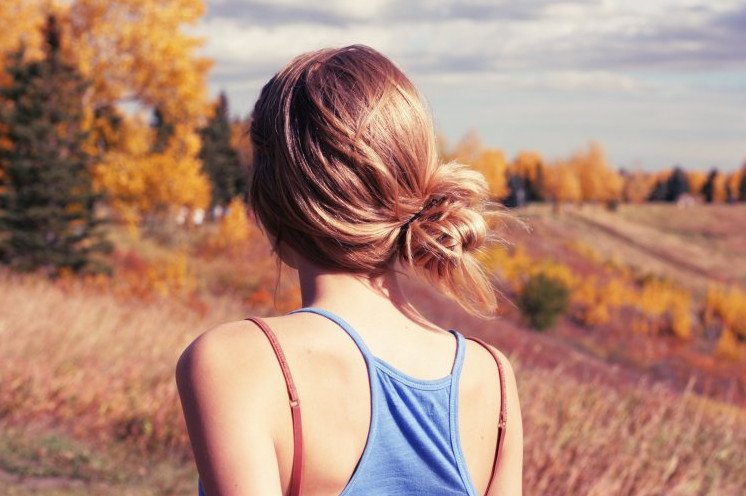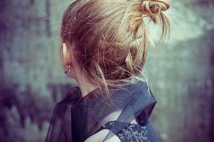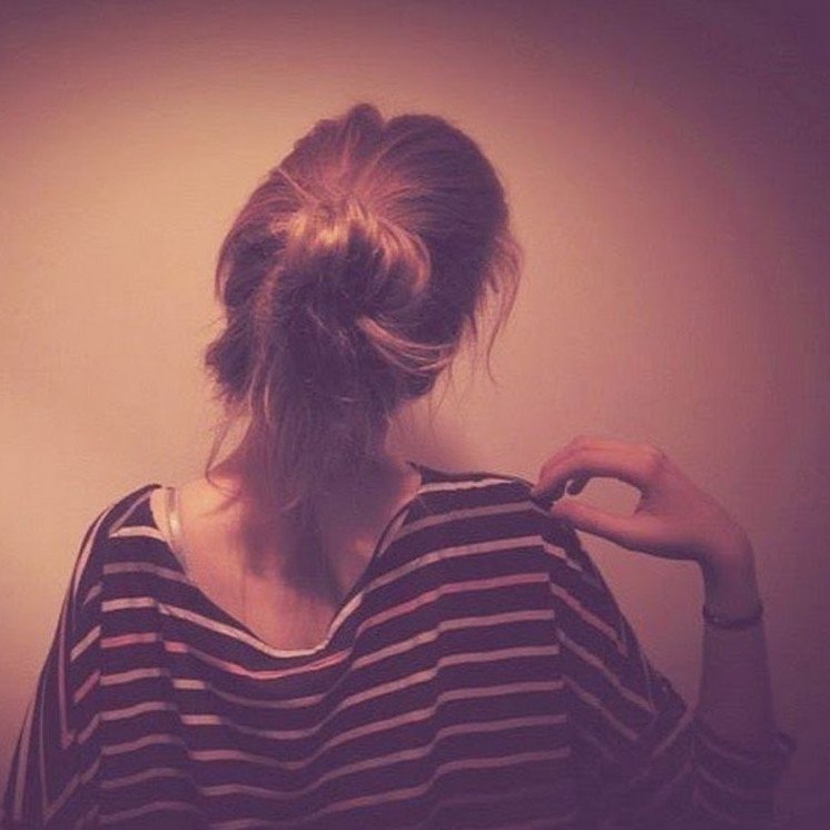 Девушка с пучком на голове со спины.