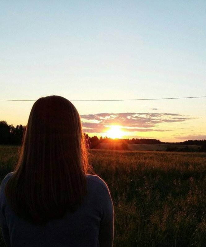 Девушка с малеханькими волосами на закате.