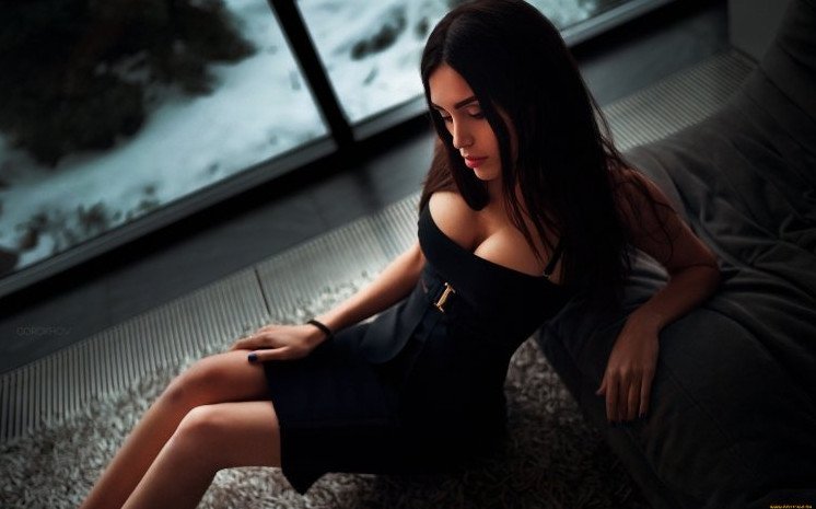 Красивая девушка эротика с брюнеткой в черном прекрасное платье.