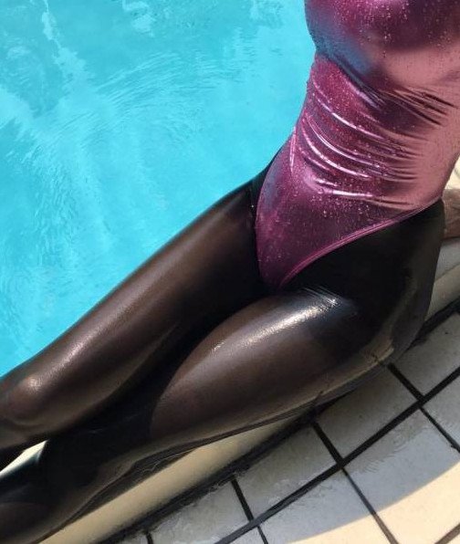 Латексный купальник и колготки.