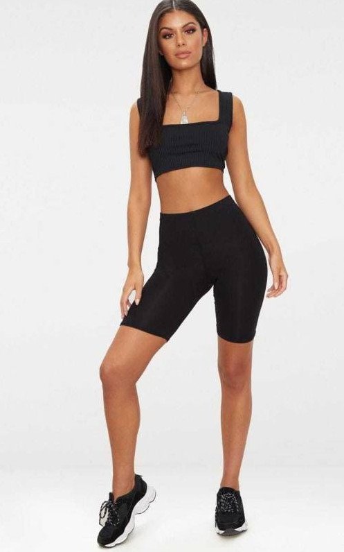 Темные облегающие шорты.