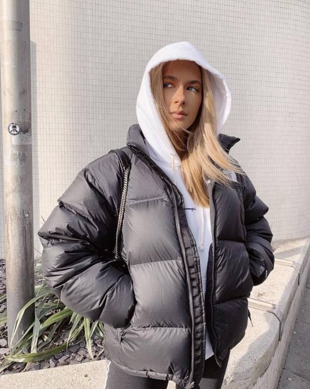 Темный пуховик оверсайз стрит стайл.