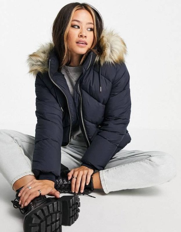 Темный пуховик с опушкой.