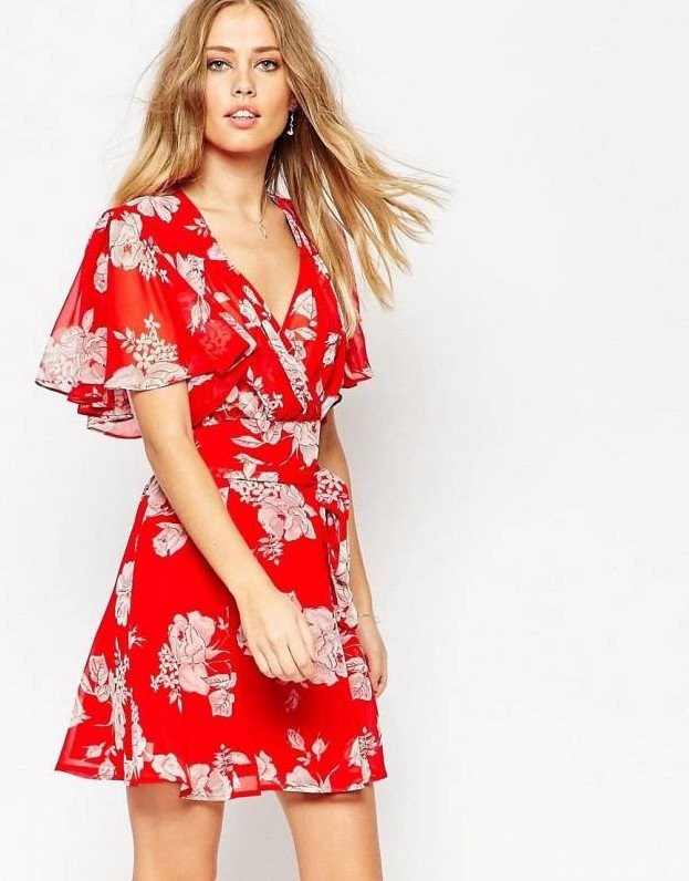 Красноватое платье в цветочек.