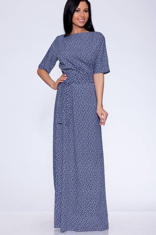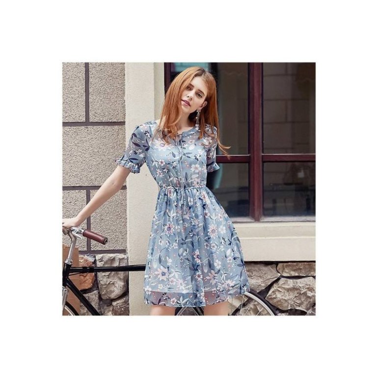 Голубое платье в маленький цветочек.