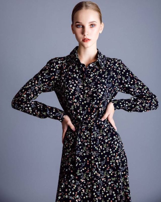 Темное платье в маленький цветочек.
