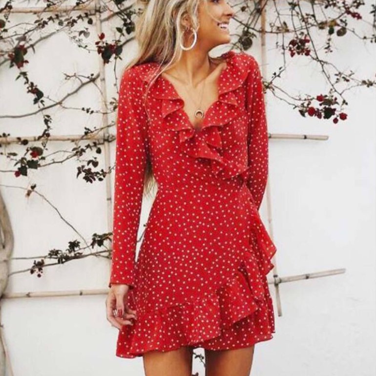 Красноватое платье в горох с запахом.