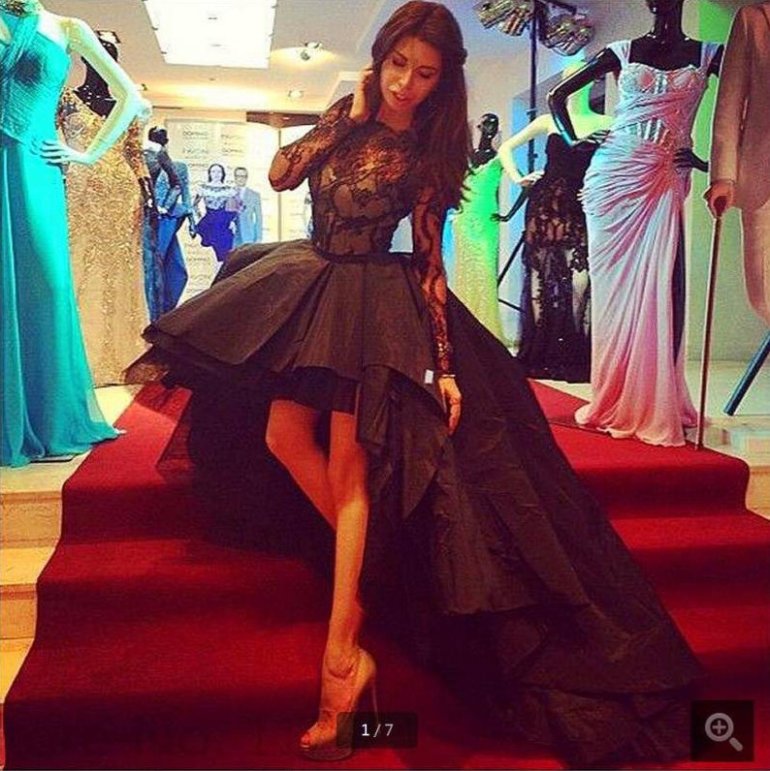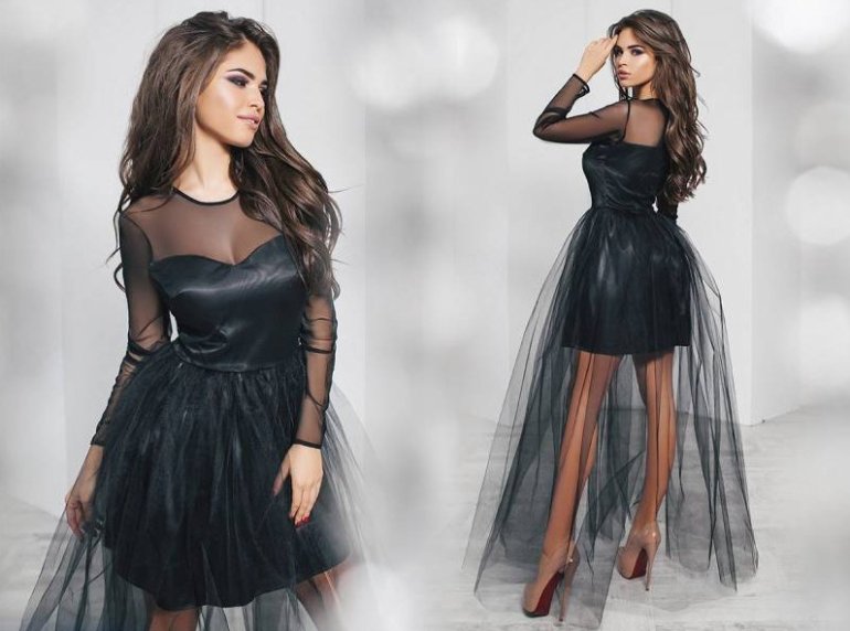 Темное платье впереди короткое сзаду длинноватое пышноватое.