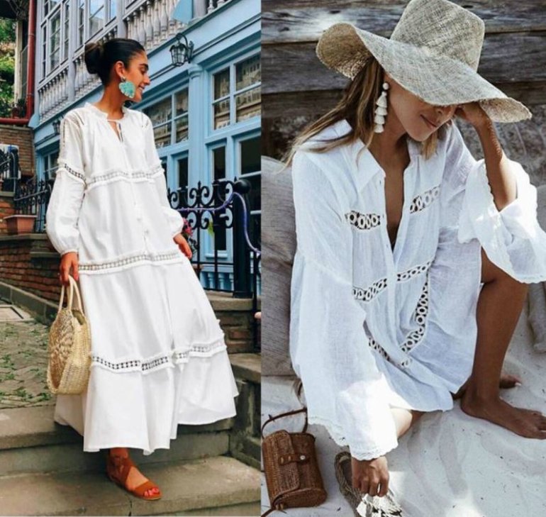 Белоснежное платье рубаха с кружевом.