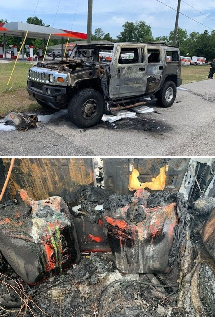 3. "Некий идиот на Хаммере залил 5 канистр с бензином, опасаясь недостатка. Поставил их в машину и закурил. Хаммеру конец"