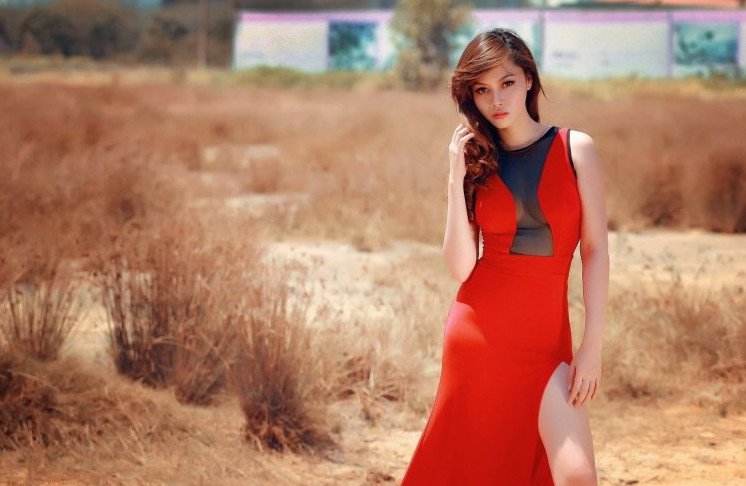 Азиатка в Красном прекрасное платье.