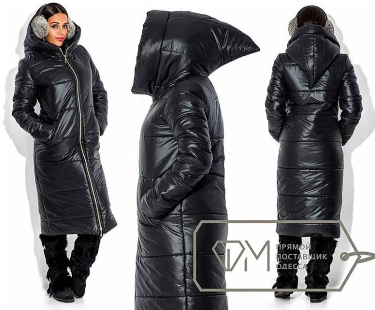 Темный длиннющий пуховик дамский.