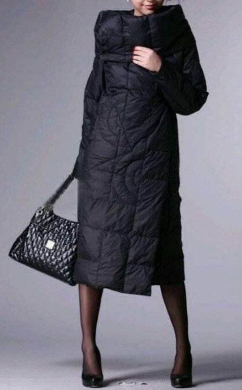 Пуховик чёрный длиннющий дамский элегантный.