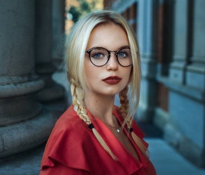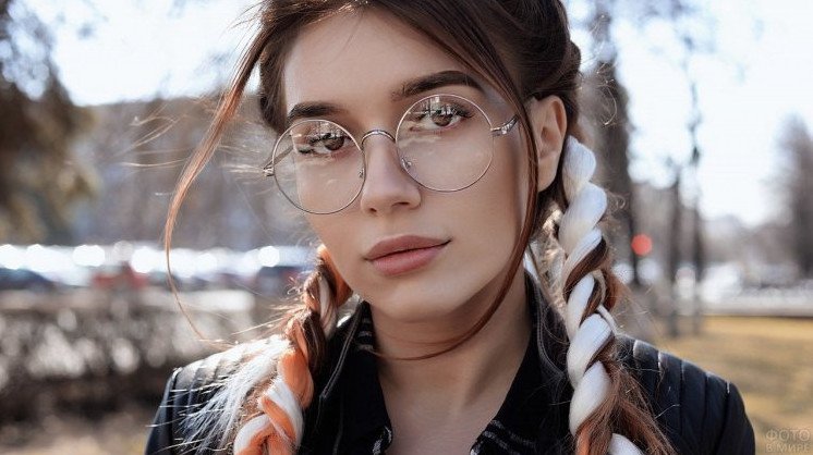 Девушка с косичками и очками.