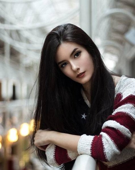 Чёрные волосы и карие глаза.