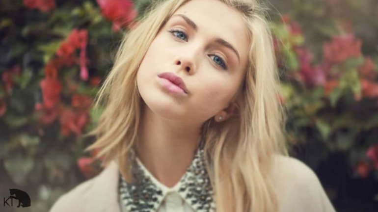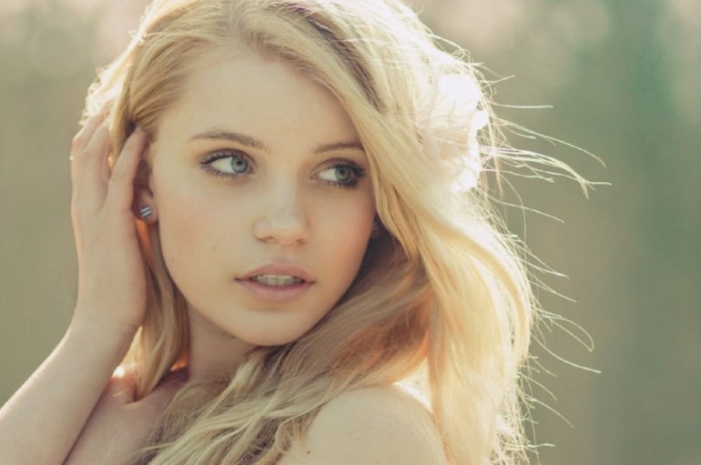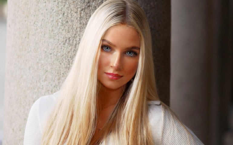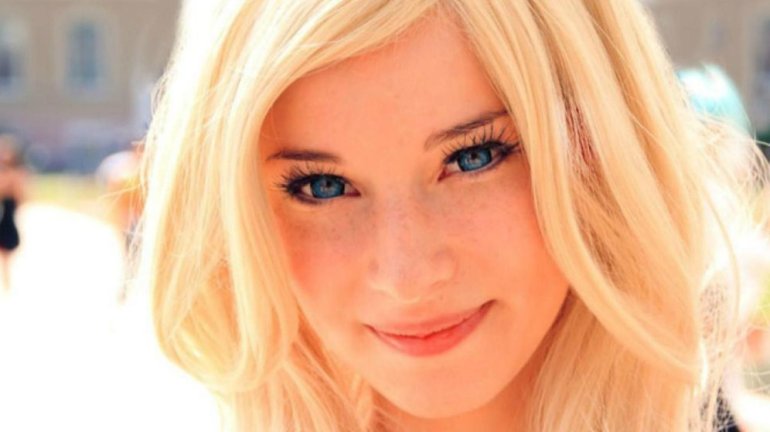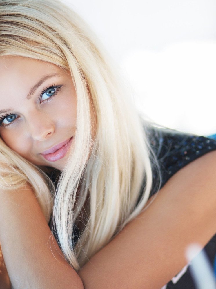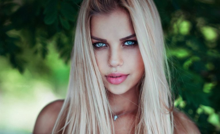 Девушка красавица с блондинистыми волосами и голубыми очами.