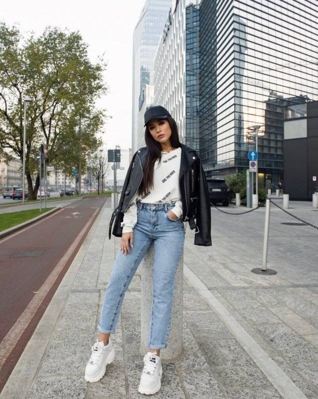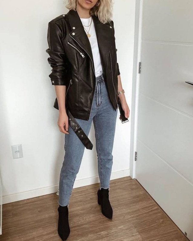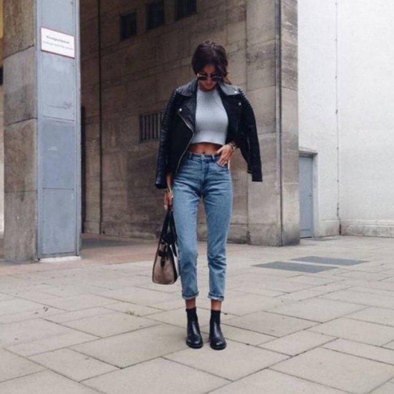 Джинсы мом и кожаная куртка.