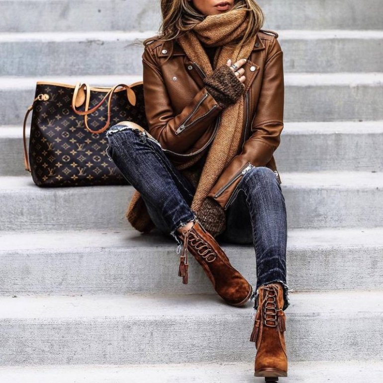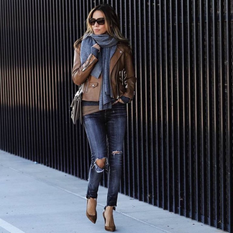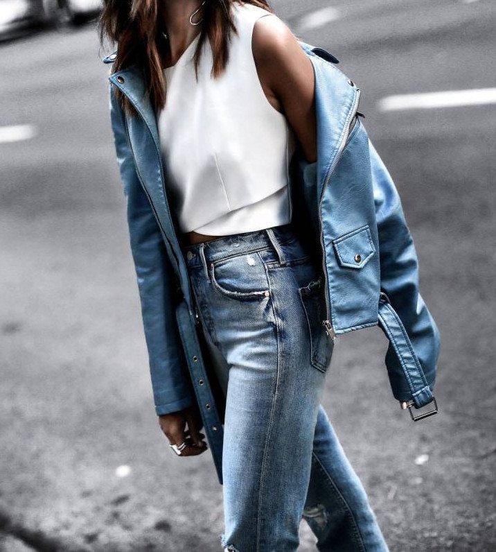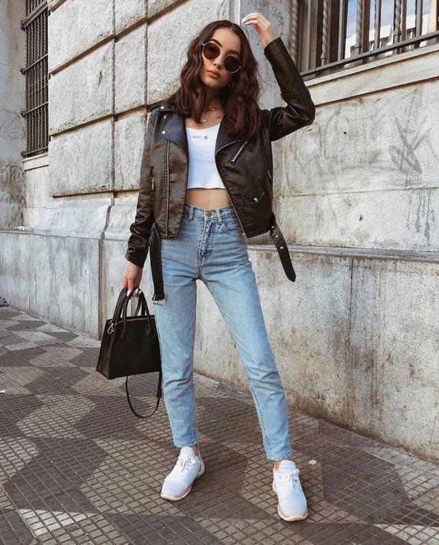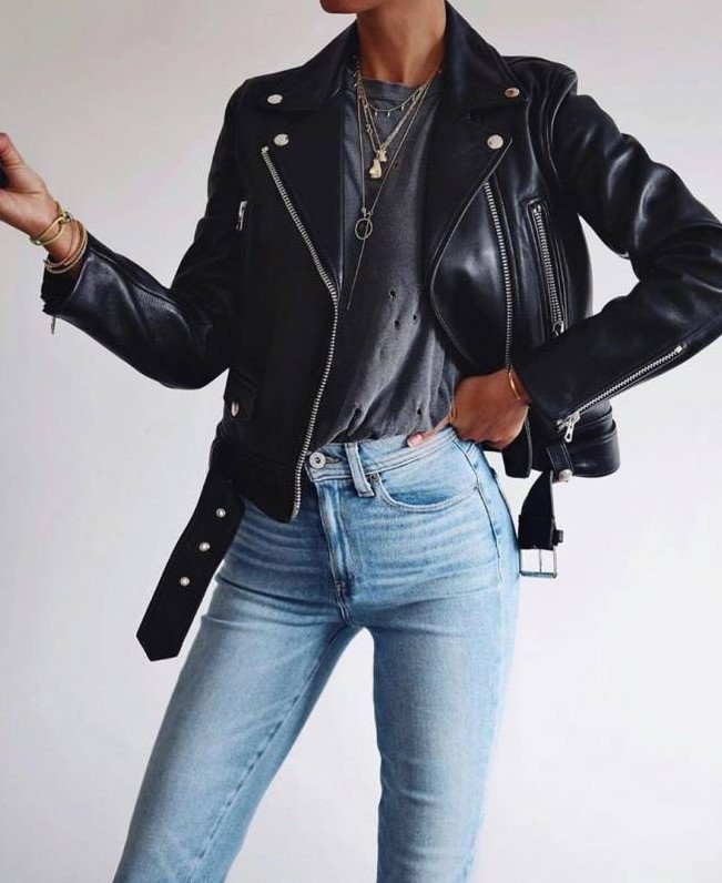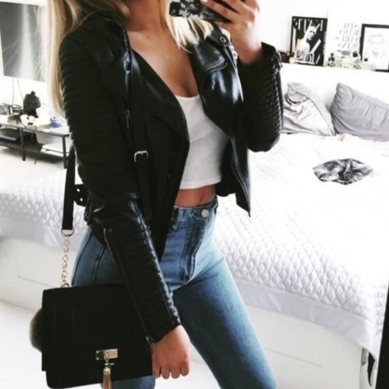 Джинсы и кожаная куртка женская.