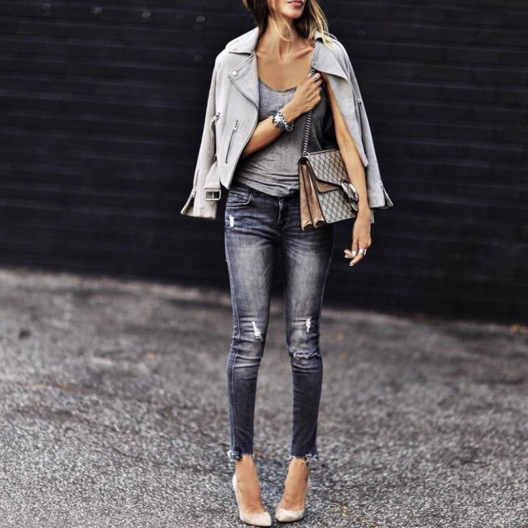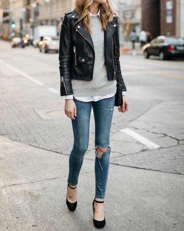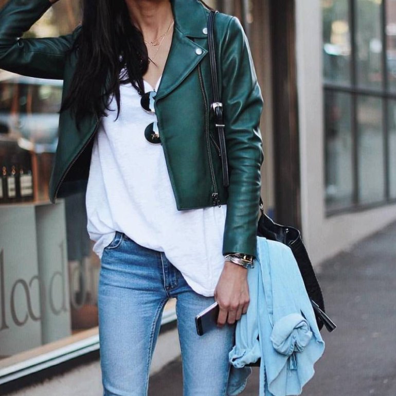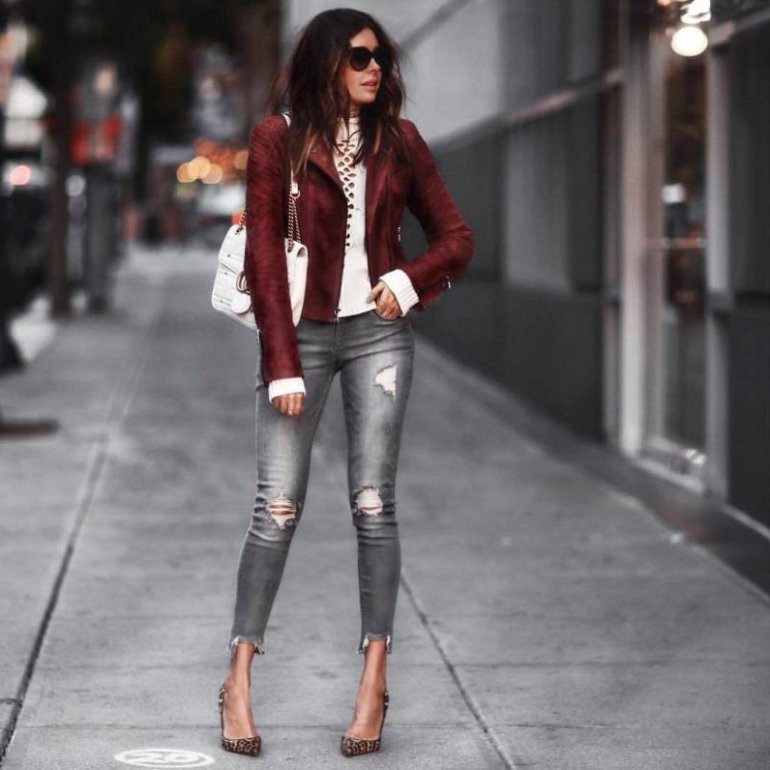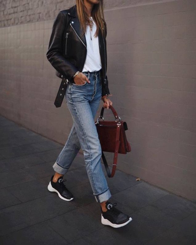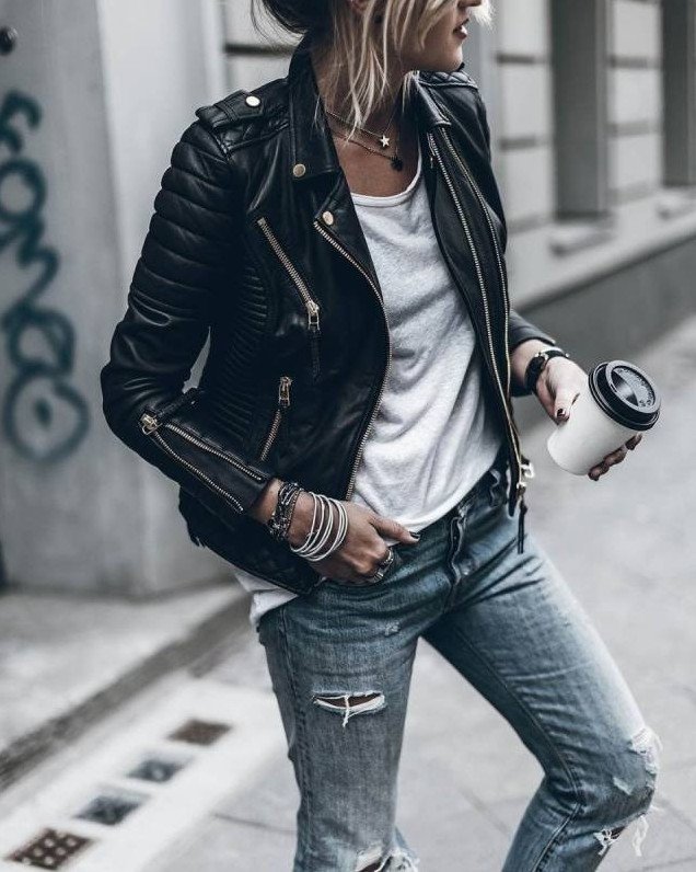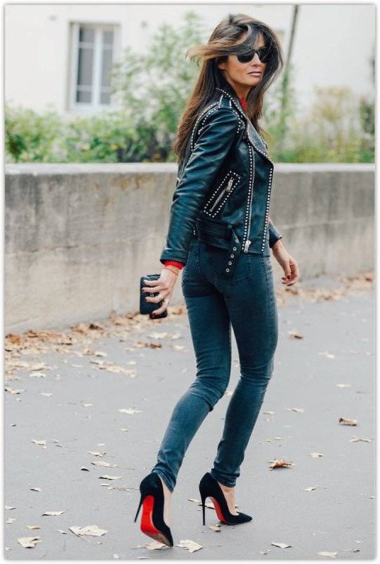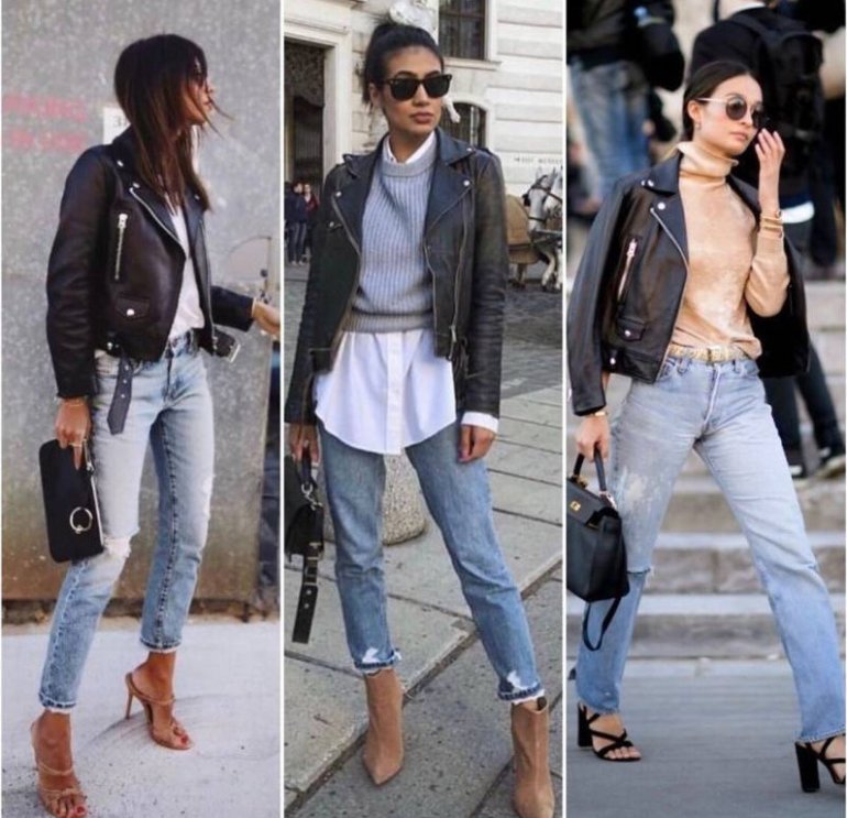 Джинсы с кожаной курткой.