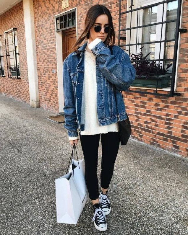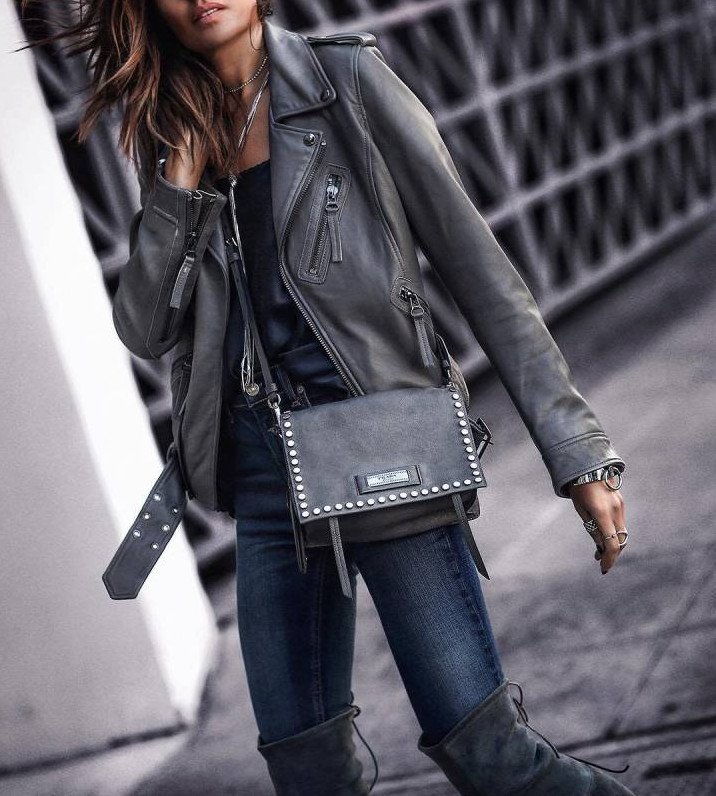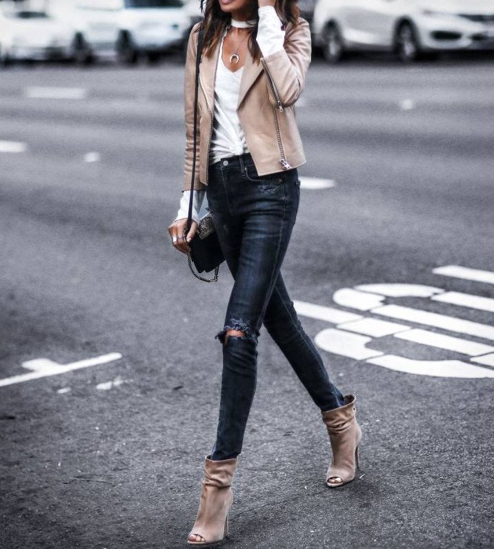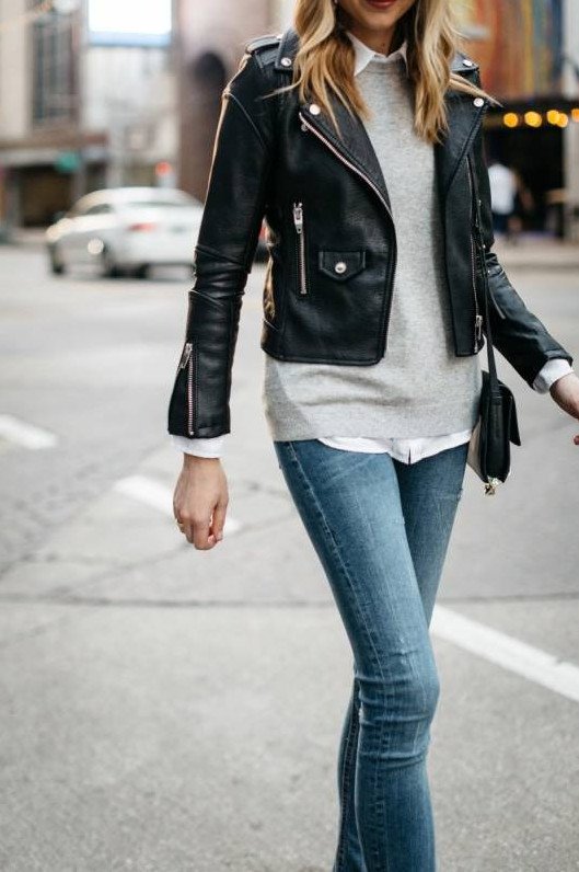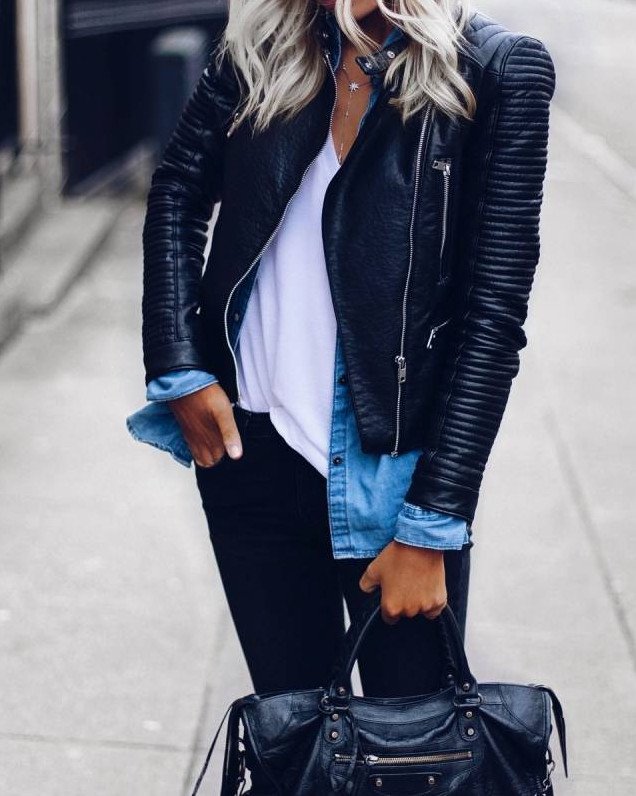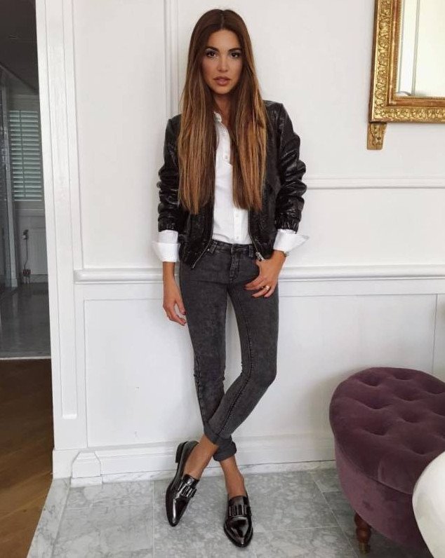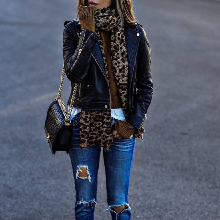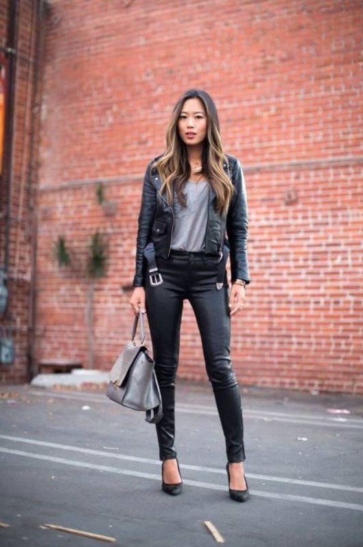 Джинсы с кожаной курткой.
