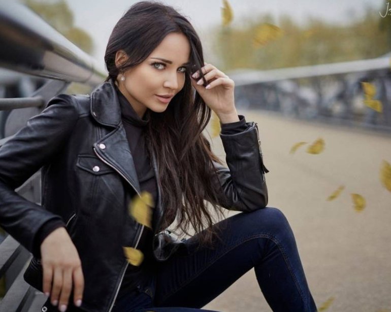 Девушка красавица в кожаной куртке.