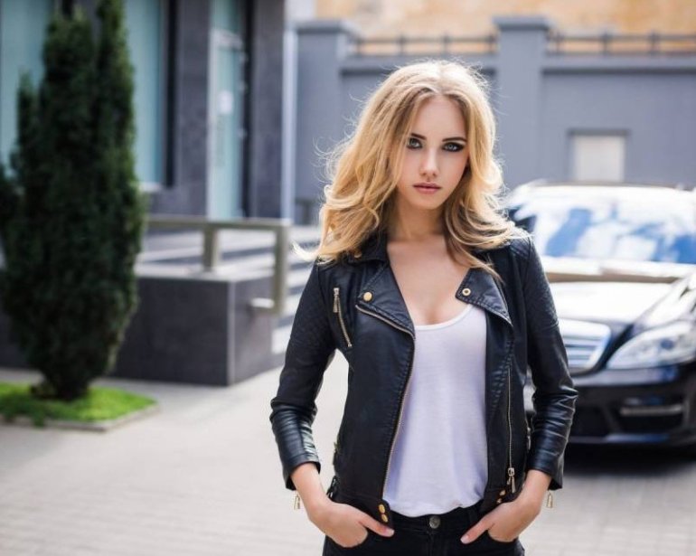 Блондинка в кожаной куртке.