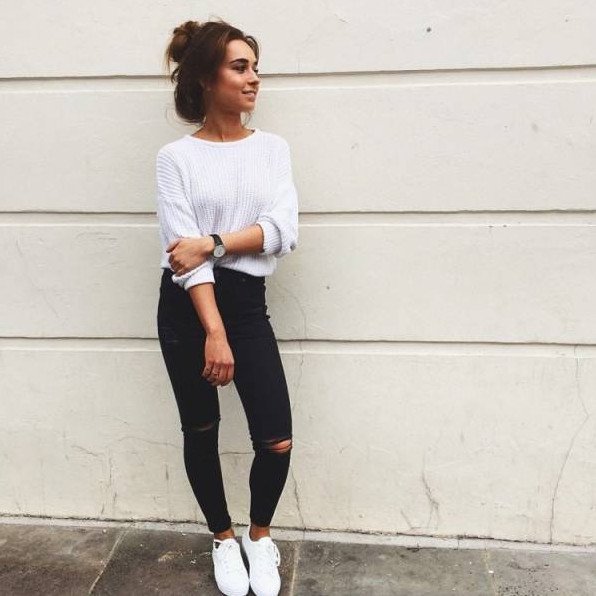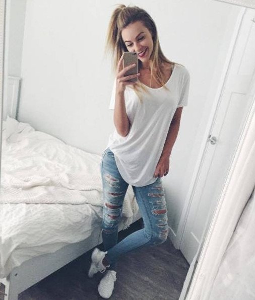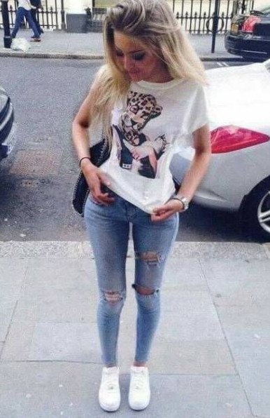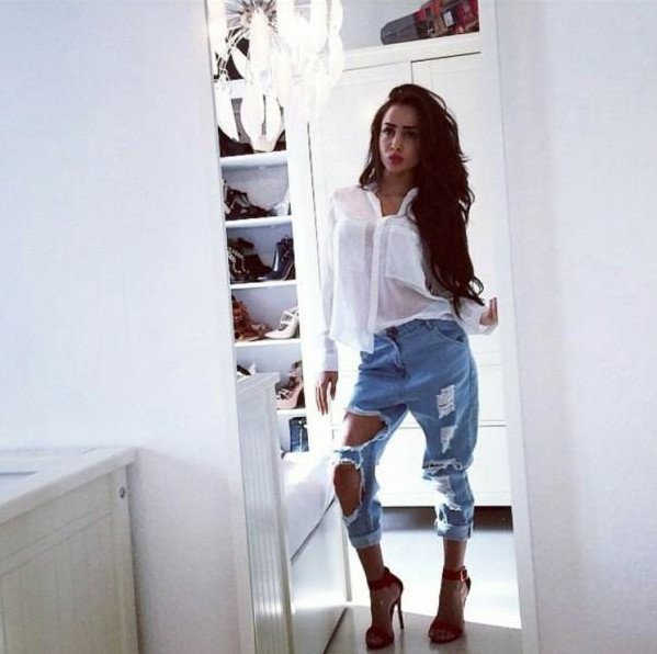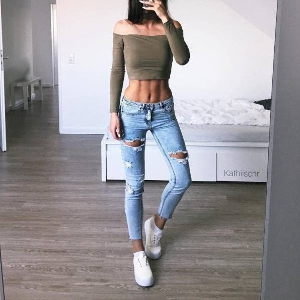 Красивая девушка эротика с брюнеткой в рваных джинсах.