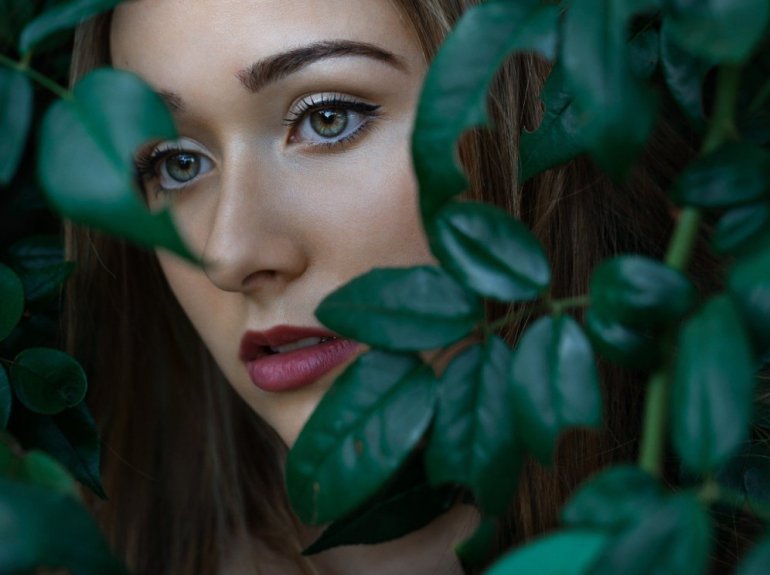 Девушка красавица в листве зеленоватой.
