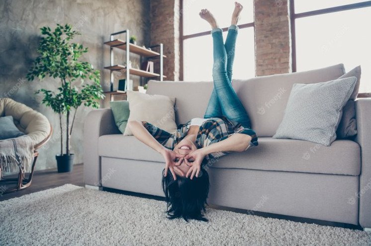 На диване вниз головой.