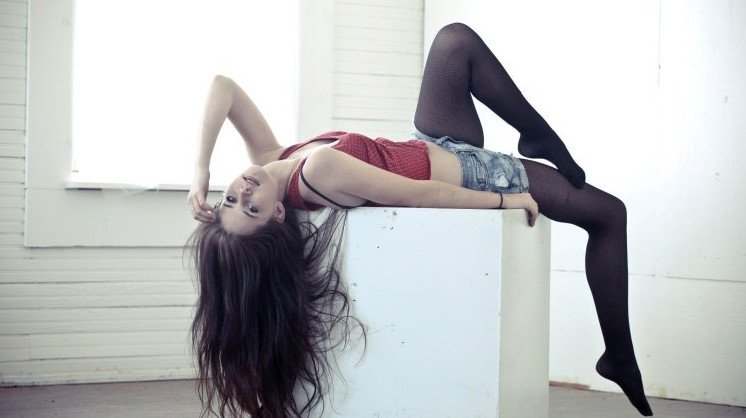 Девушка с длинющими волосами в чулках.