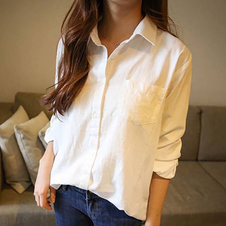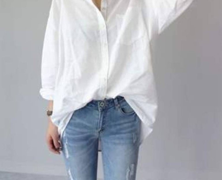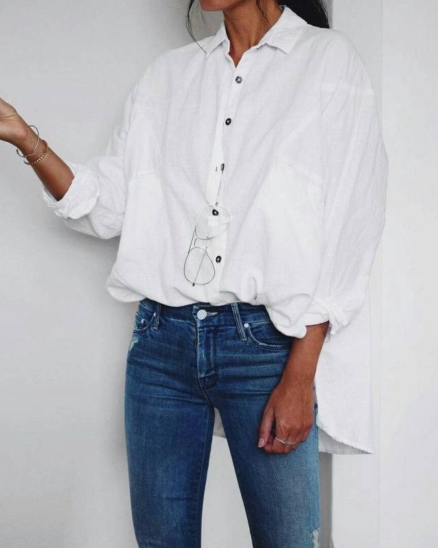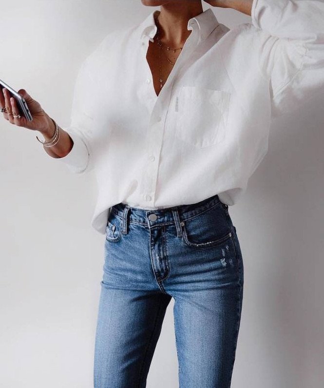 Белоснежная рубаха и джинсы.