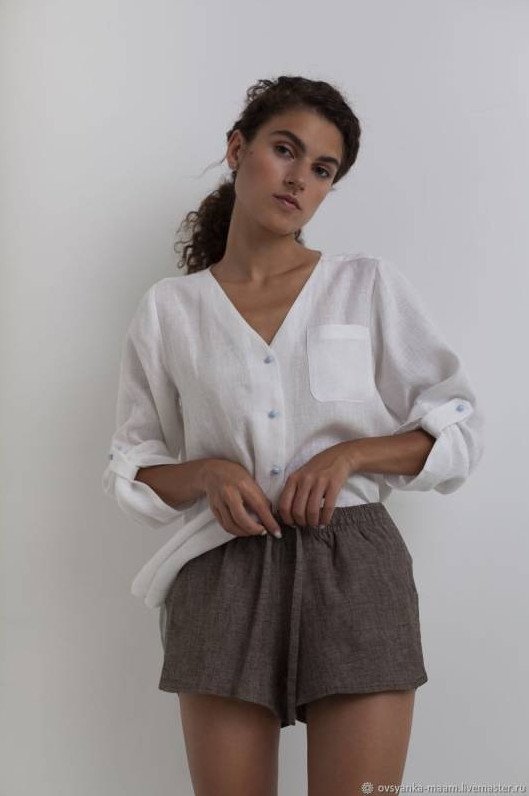 Льняная рубаха женская белоснежная с шортами.
