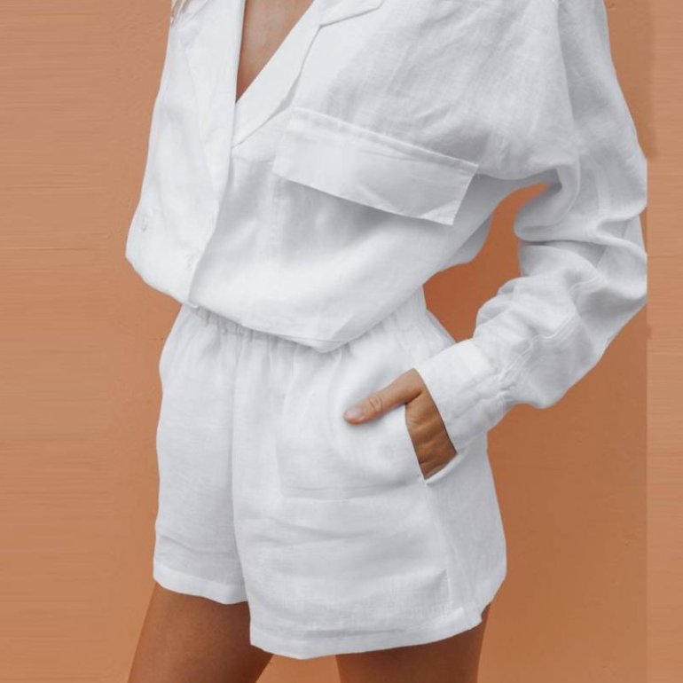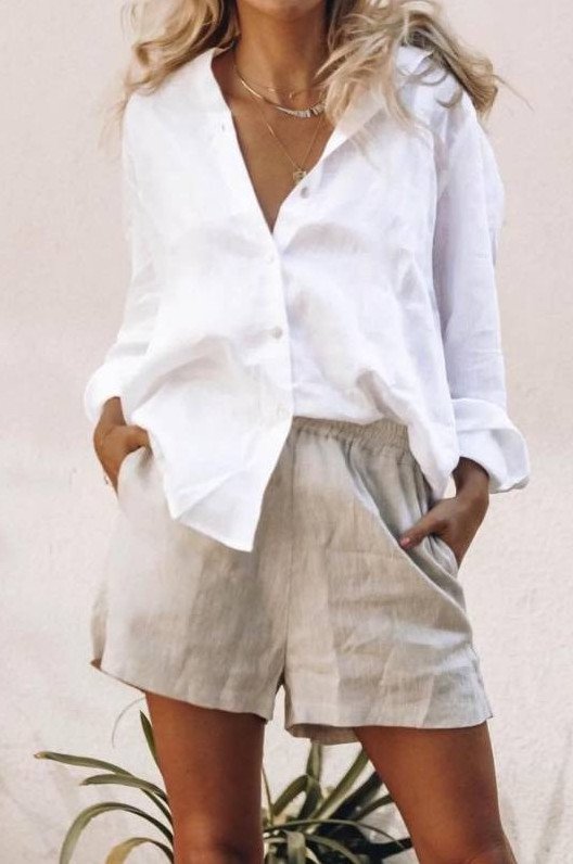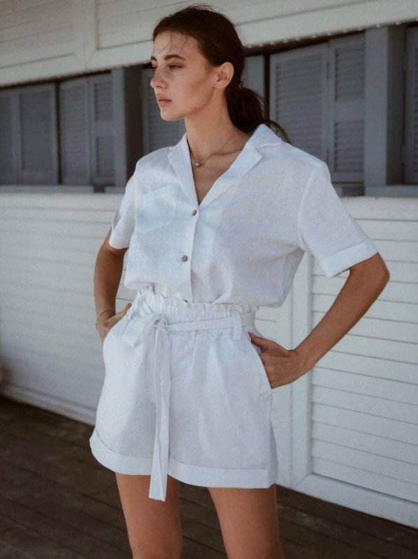 Образы с белоснежными льняными шортами.