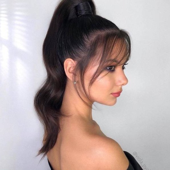 Прическа хвостик с челкой.