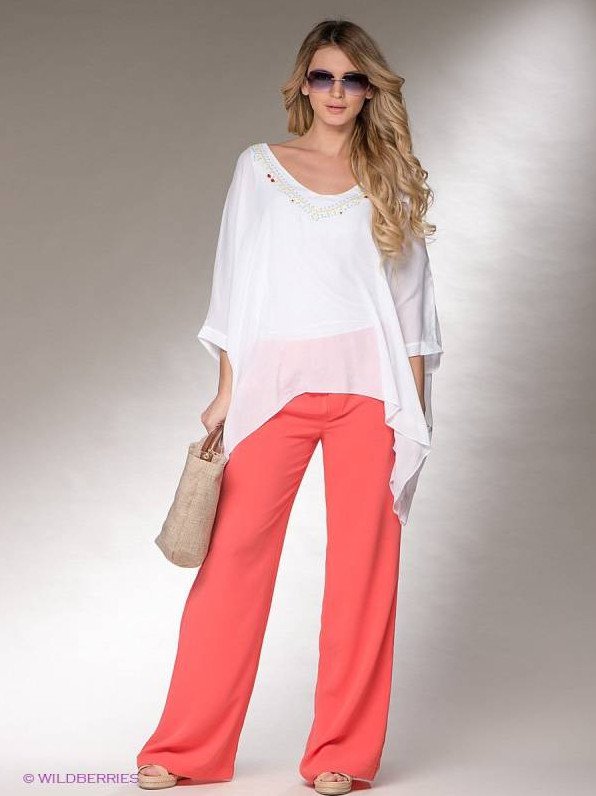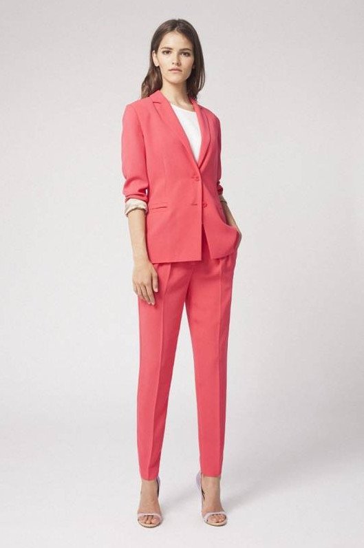 Брючный костюмчик кораллового цвета.