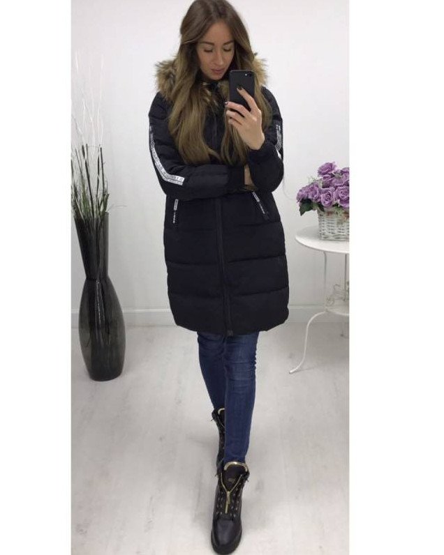 Темный пуховик с черным мехом песца.