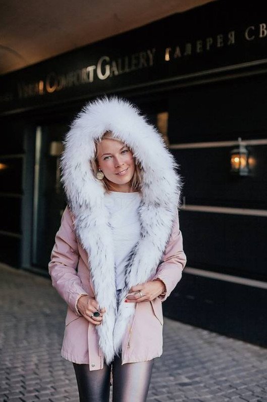 Розовая парка с белоснежным мехом.