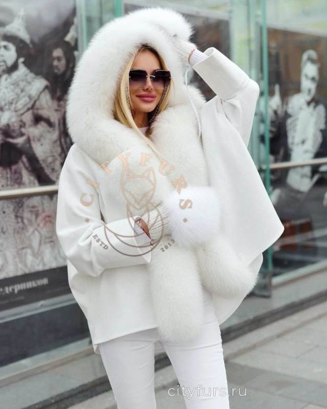 Белоснежное пальто с мехом.