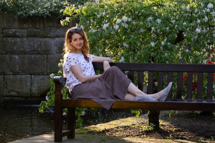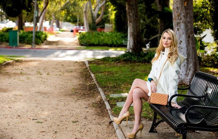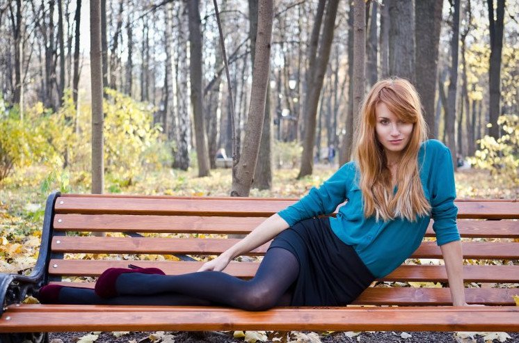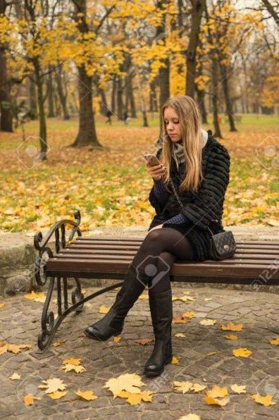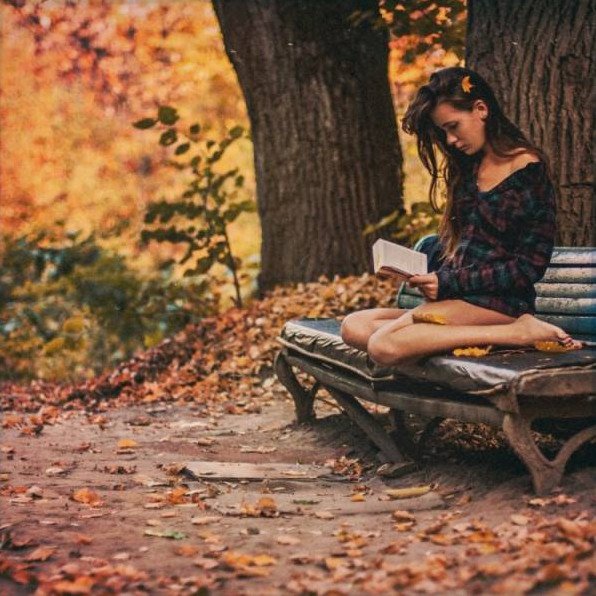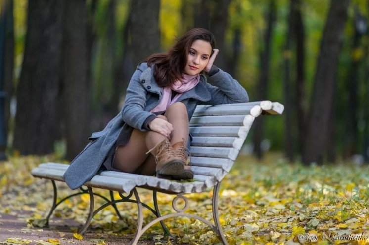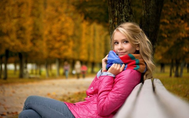 Девушка посиживает на лавке в парке в осеннюю пору.