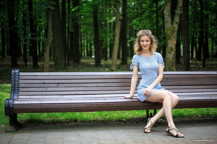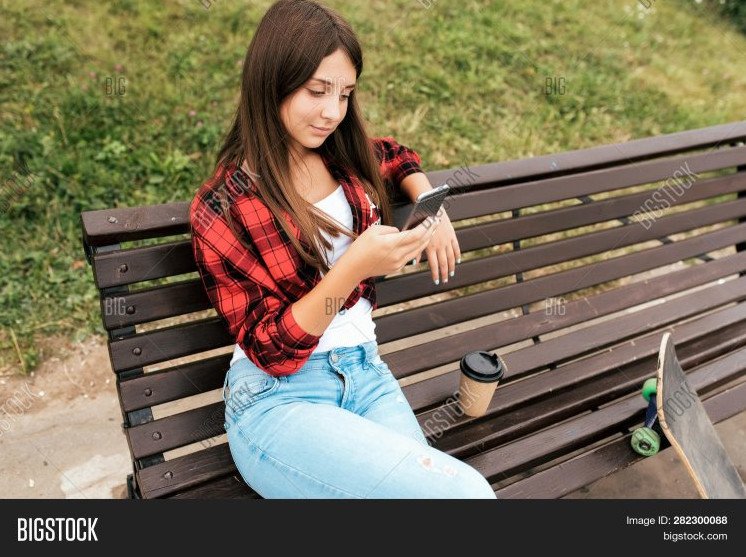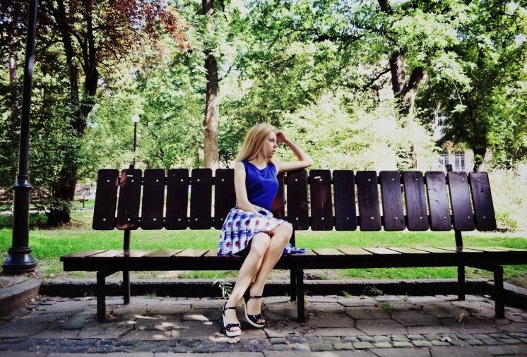 Прекрасная девушка-подросток посиживают на лавочке в парке.