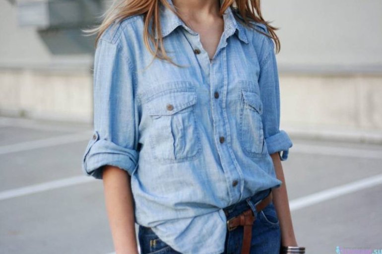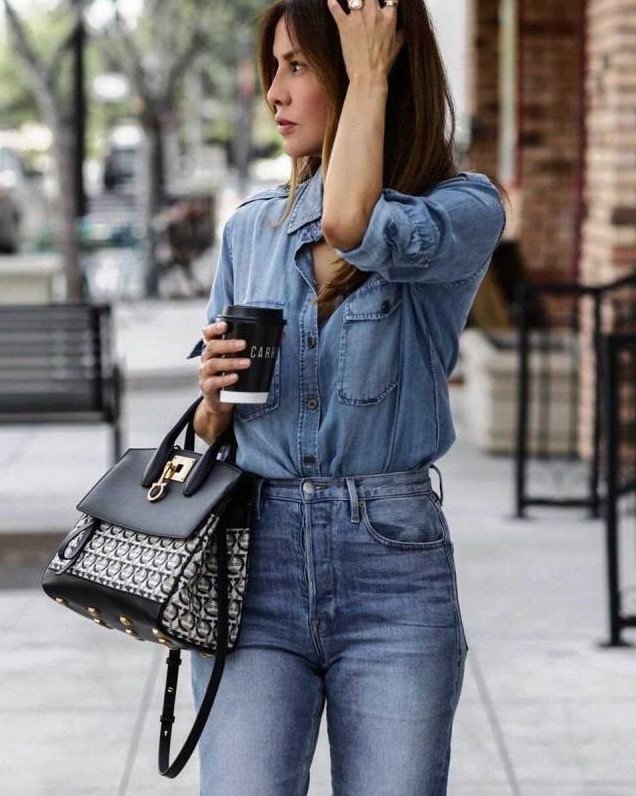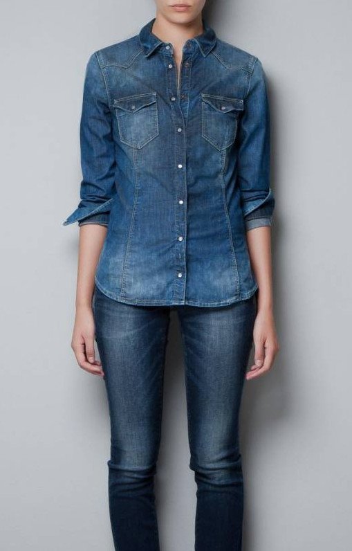 Джинсы с джинсовой рубахой.