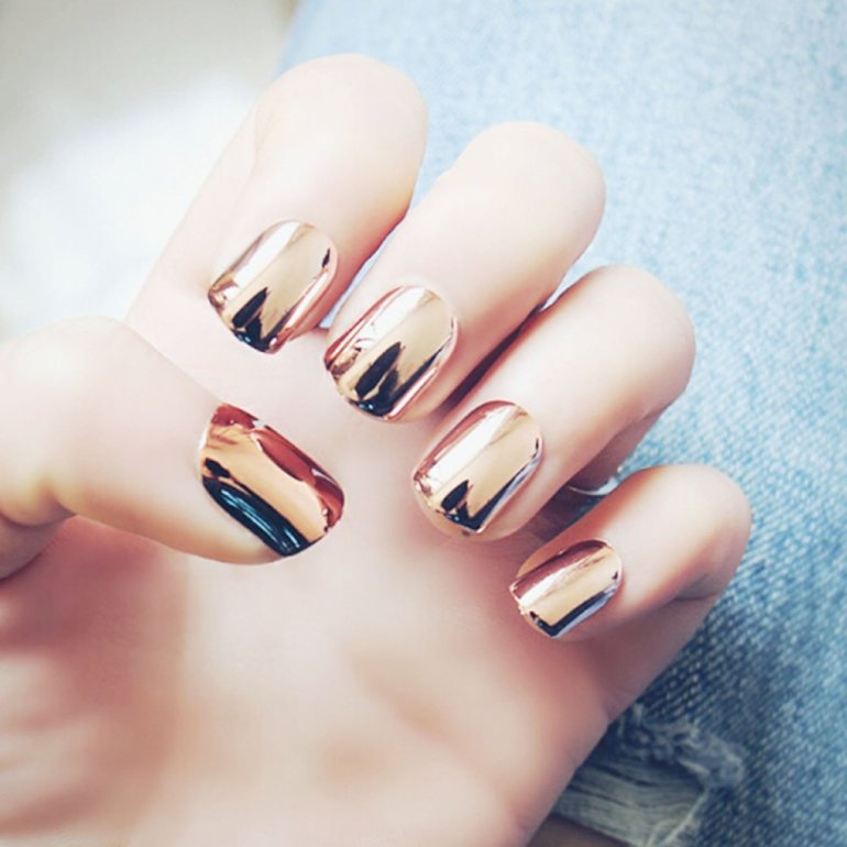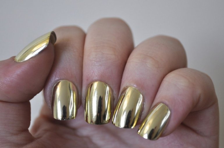 Золотой лак для ногтей с эффектом зеркала.