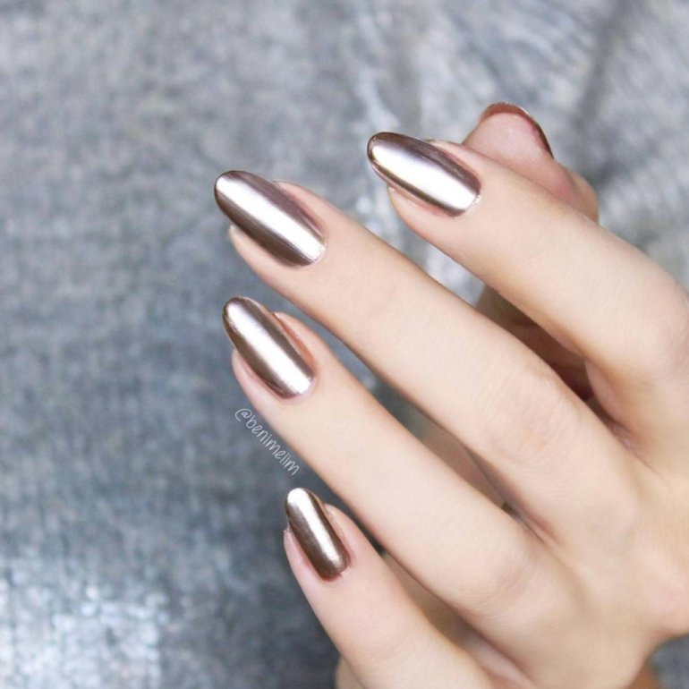 Зеркальный маникюр бронзовый.