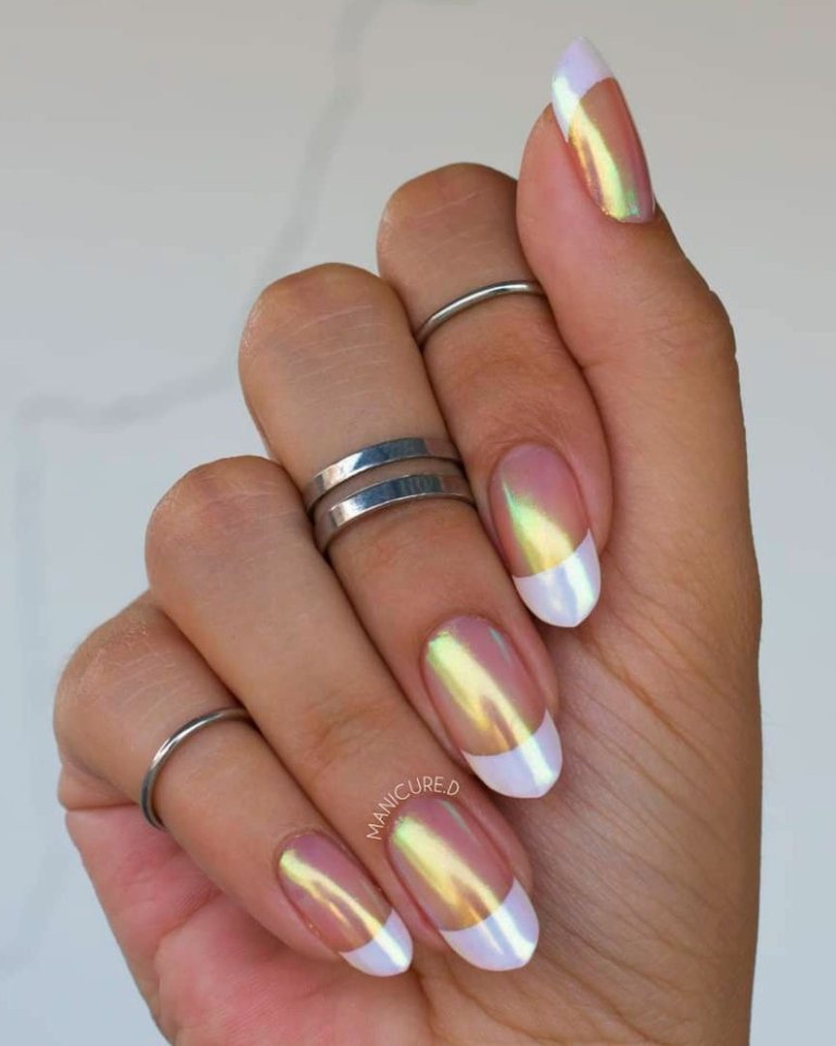Французский маникюр с зеркальным кончиком.
