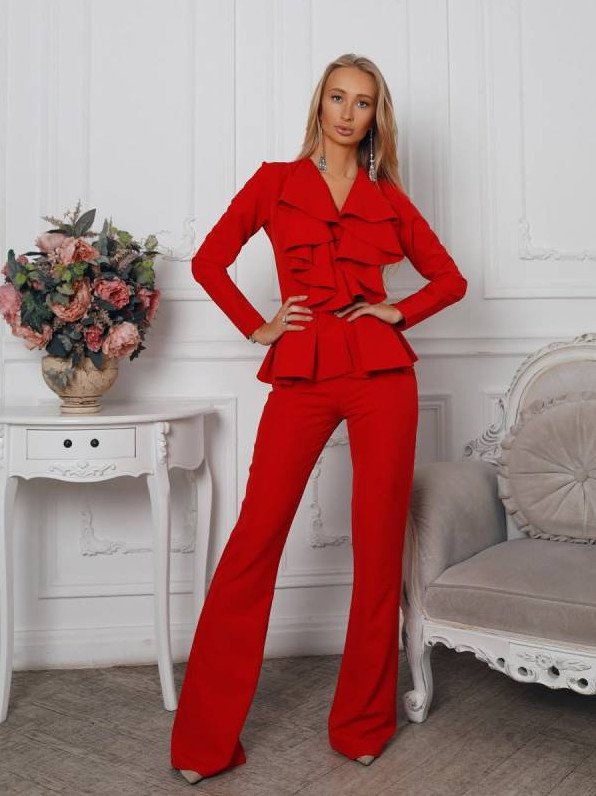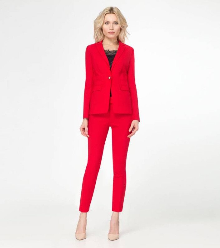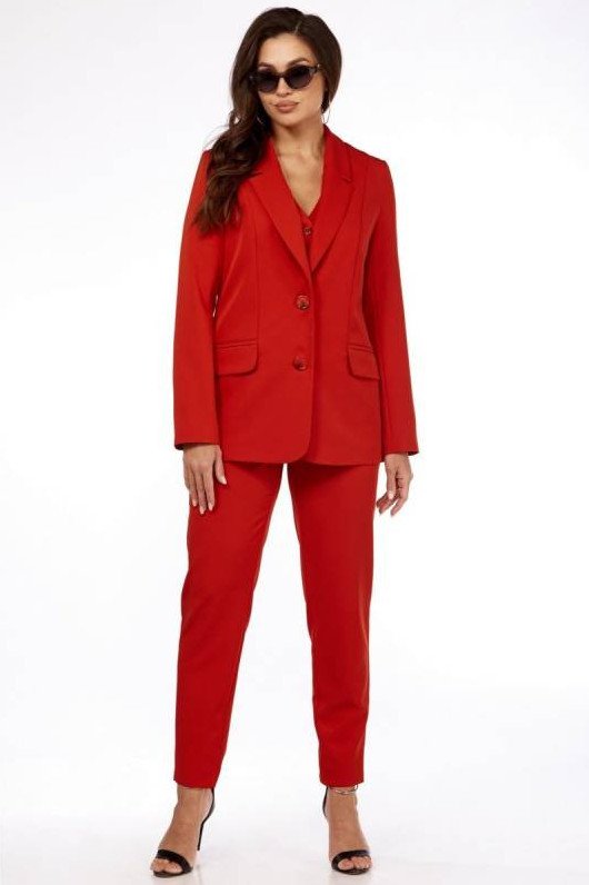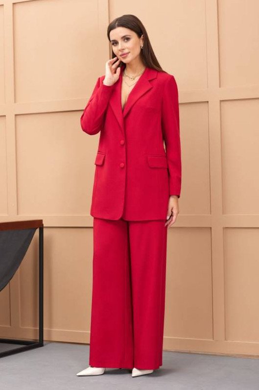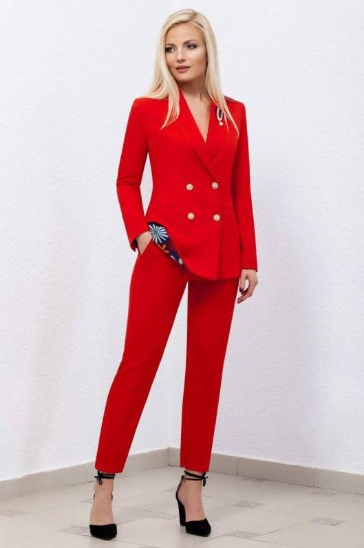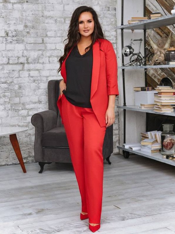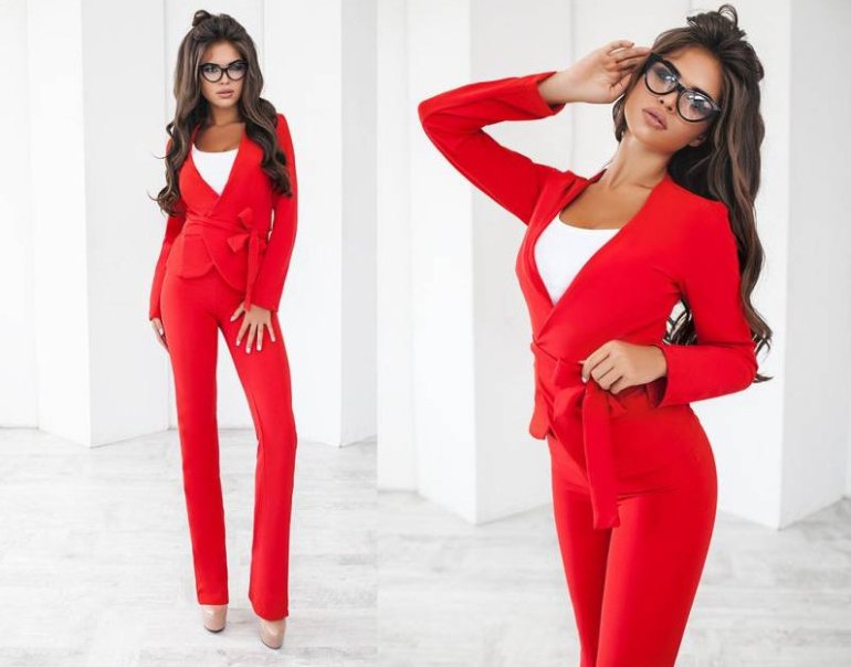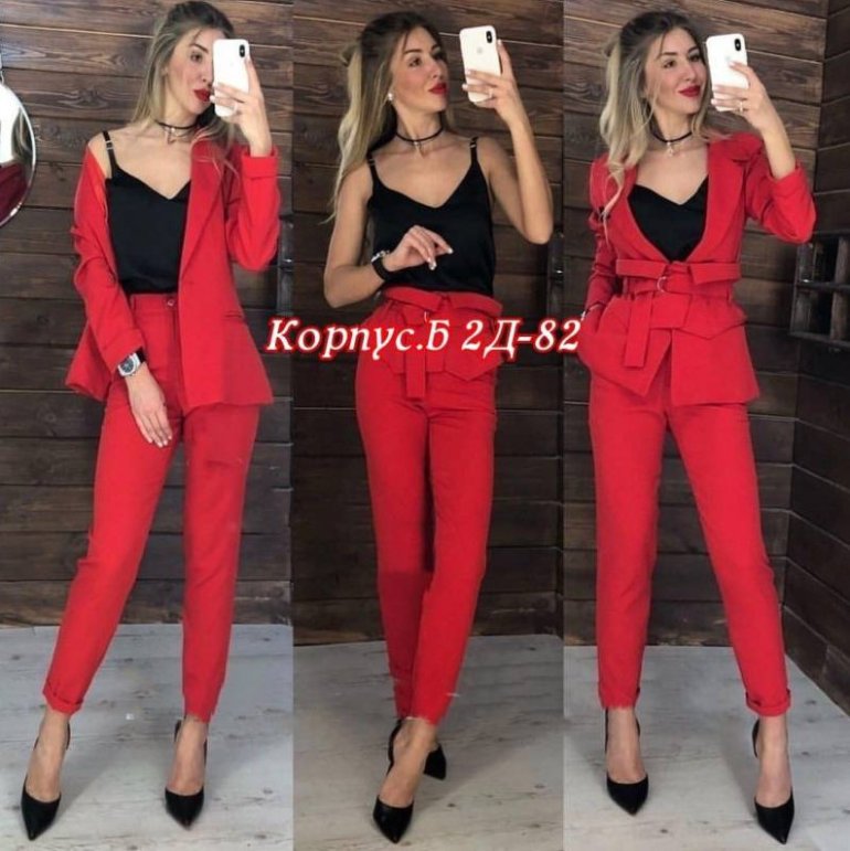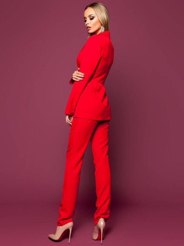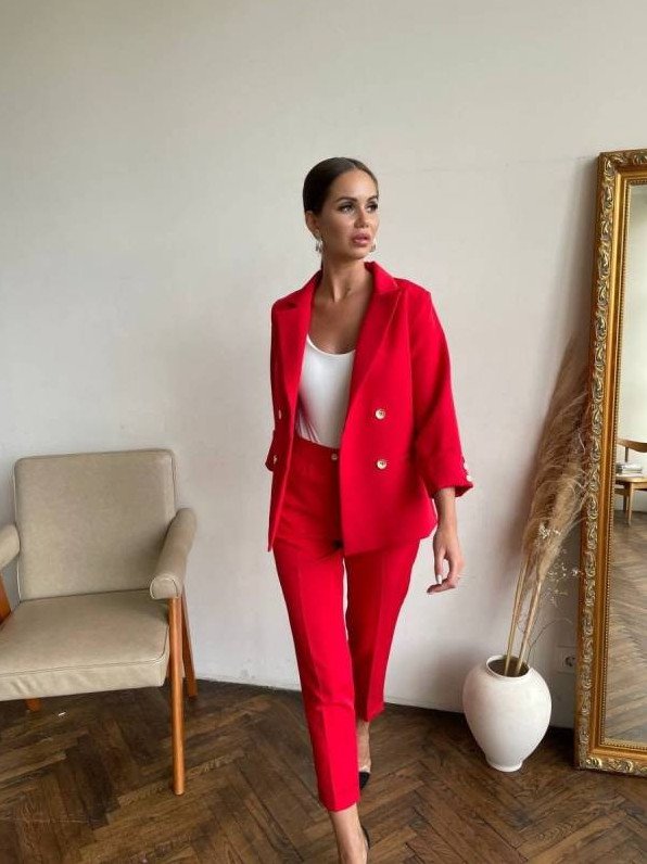 Красивая женщина в Красноватом костюмчике в полный рост.