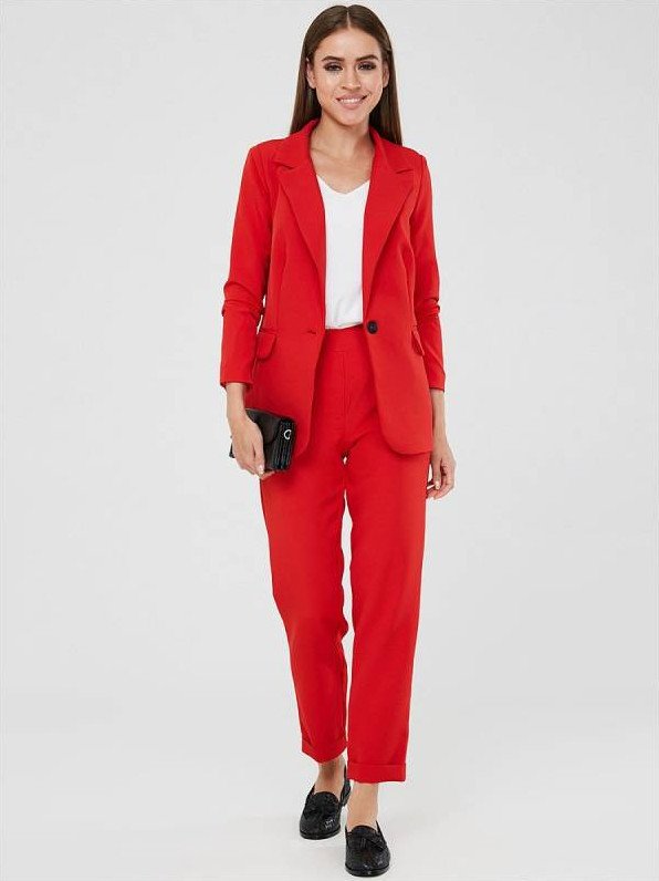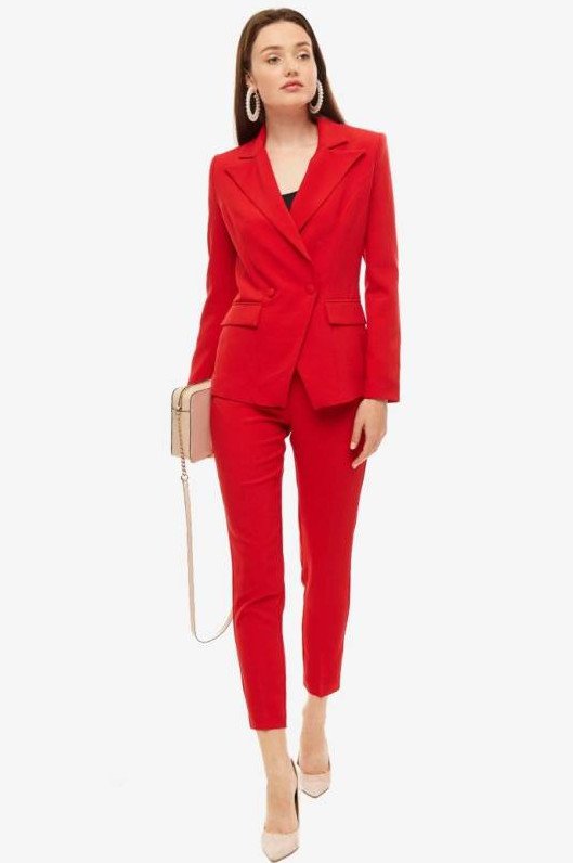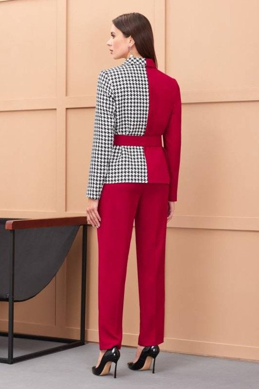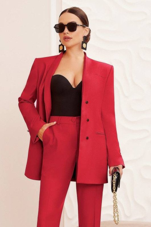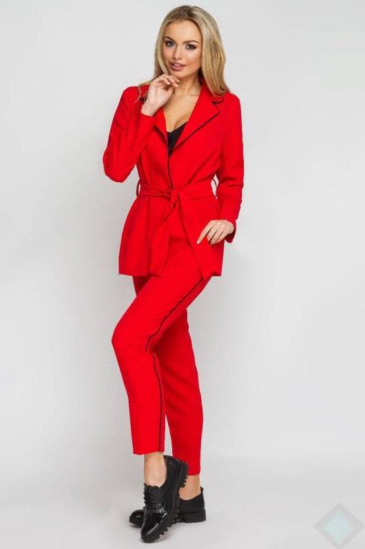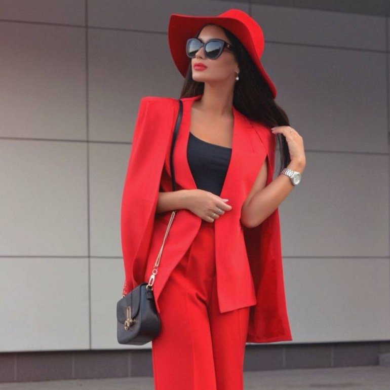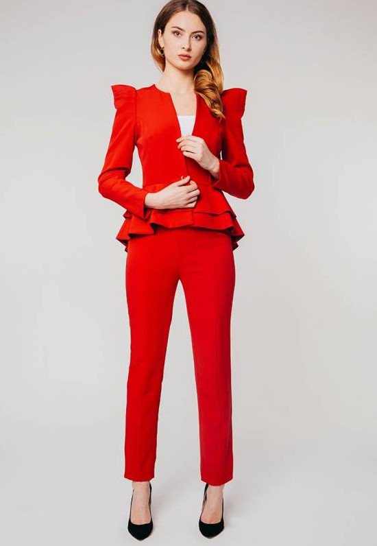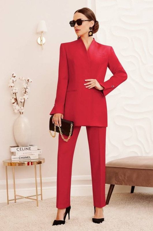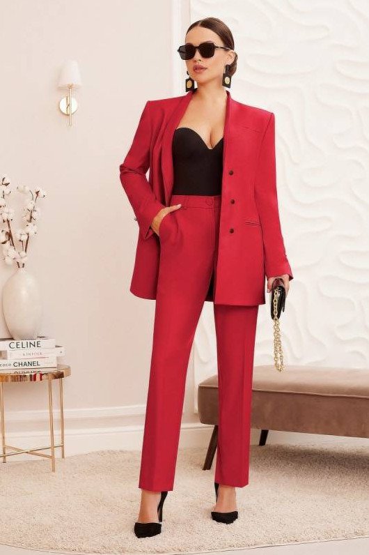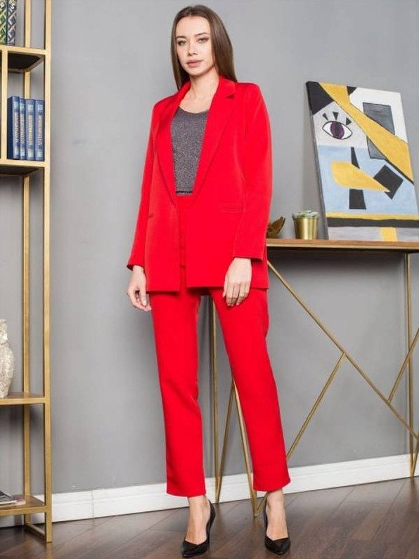 Красивая женщина в Красноватом костюмчике в полный рост.