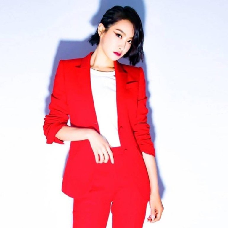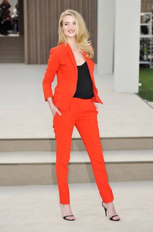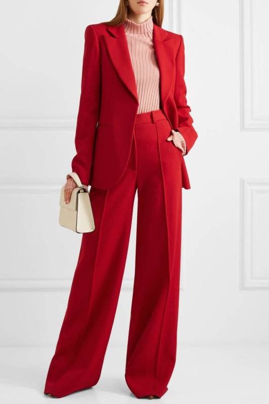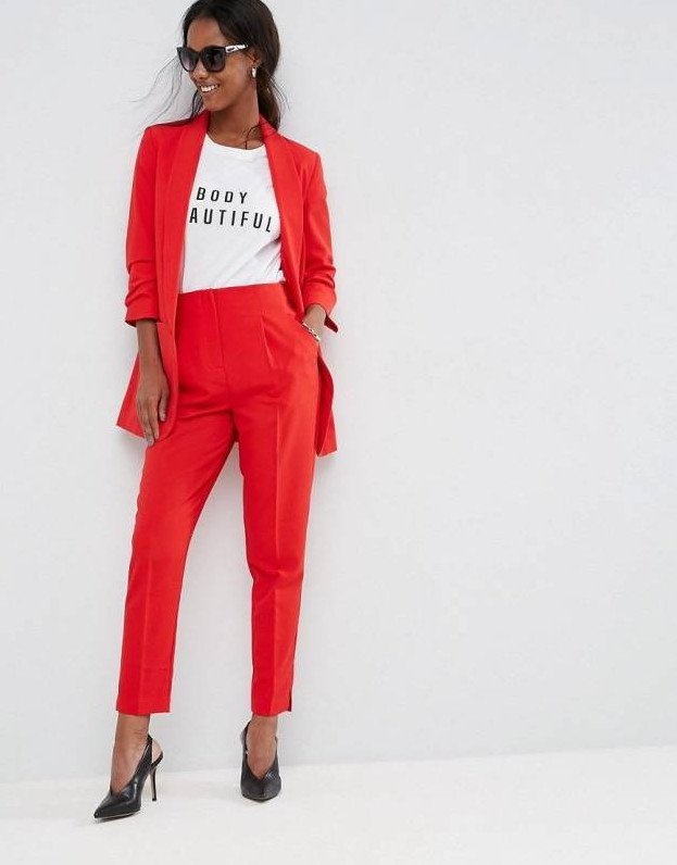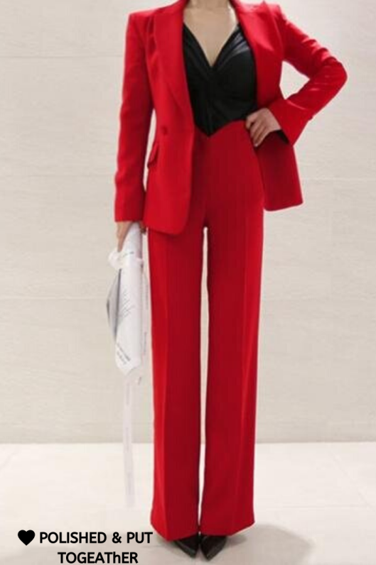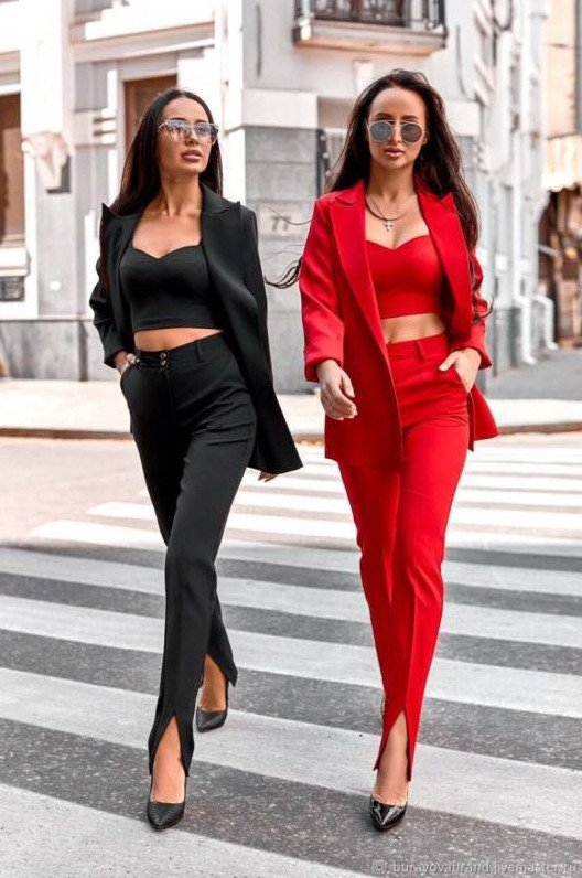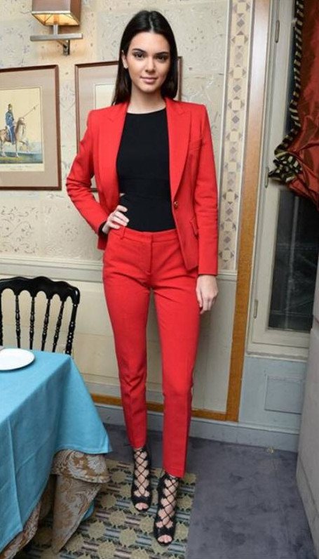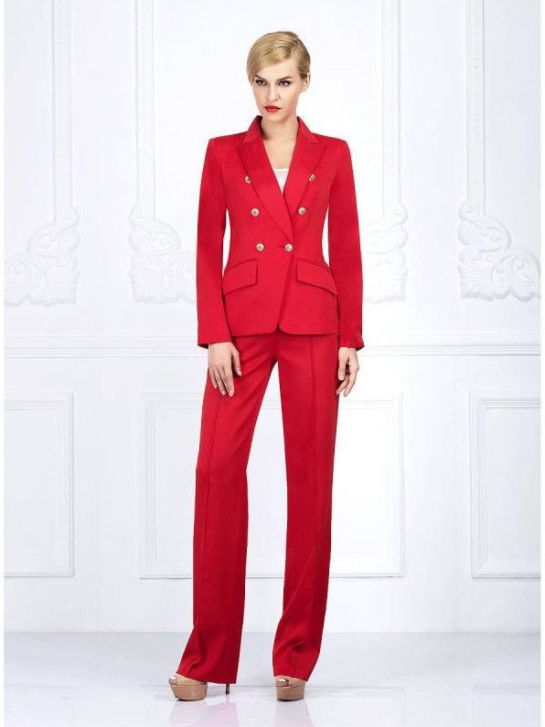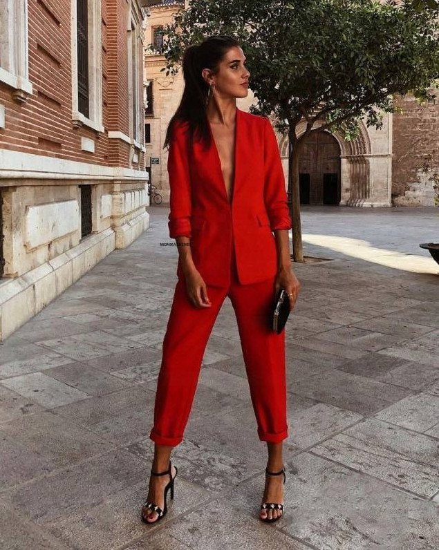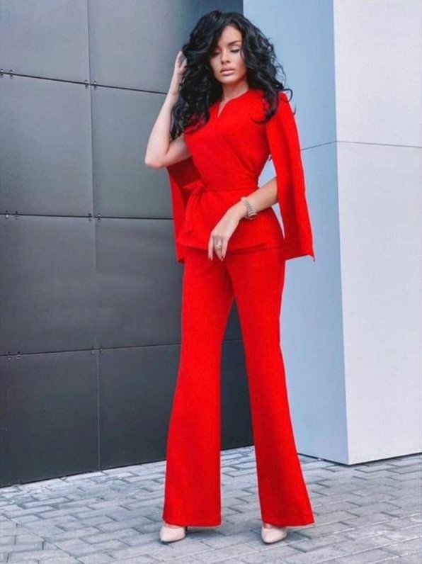 Красивая женщина в Красноватом костюмчике в полный рост.