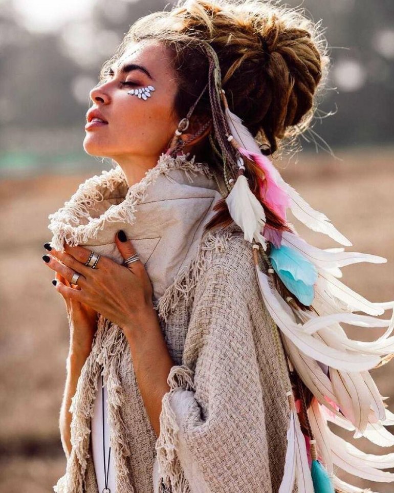 Прически с перьями бохо.