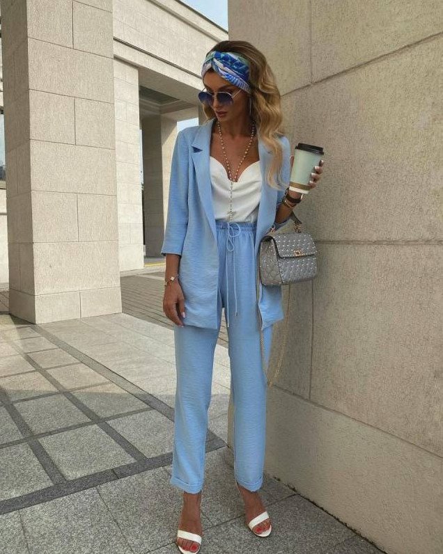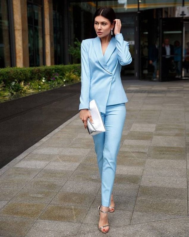 Образ в голубом костюмчике красивая женщина.
